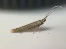 The wingspan is 10–11 mm. Adults have a gray head, although it whitish laterally. The forewings are brown-gray with some dark scales along the faintly white-lined veins. The fringes are dark gray. The hindwings and fringes are dark gray.[5] There are two generations per year.