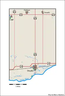 Colfax County was established by the Nebraska legislature in 1869, as part of the division of Platte County into three parts. The new county was named for Schuyler Colfax, then the vice-president of the United States. The site of Shell Creek Station on the Union Pacific Railroad was chosen as the county seat, and renamed Schuyler also after Colfax.[4] Schuyler was incorporated in 1870, and the county's first courthouse was constructed in 1872.[5][6]