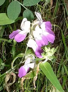 Collinsia is a genus of about 20 species of annual flowering plants, consisting of the blue eyed Marys[1] and the Chinese houses. It was traditionally placed in the snapdragon family Scrophulariaceae, but following recent research in molecular genetics, it has now been placed in a much enlarged family Plantaginaceae.