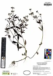 Collinsia childii is an annual herb producing an erect, branching stem up to about 35 centimeters tall coated in glandular hairs. The leaves are oblong, flat and sometimes slightly toothed.