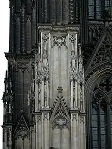 The Cologne Cathedral Seal (German: Kölner Domplombe) was a section of unclad brickwork which covered destroyed masonry on an exterior pillar of Cologne Cathedral. In November 1943, during an air raid by the allies, a bomb seriously damaged a pillar on the northern tower of the cathedral, sparking fears for the structural integrity of the surrounding parts of the building. The missing sandstone was replaced with bricks by the spring of 1944, which remained visible on the north tower for over 60 years. As the last major war damage, the seal was repaired between 1995 and 2005 and faced with cut stone. Some experts had argued that the seal should be left undisguised as an anti-war memorial.[1]