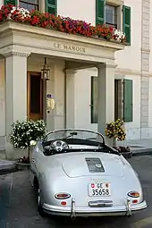 Porsche 1600 in front of "Le Manoir" or Manor House in Cologny