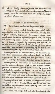 Colonel Borremans (also known as Van den Elsken) founded a unit of volunteers, known as Les Chasseurs de Bruxelles (the Hunters of Brussels), at the time of the 1830 Belgian revolution, a coup that led to the separation of the provinces of the South from the United Kingdom of the Netherlands and therefore to the birth of the present Belgian state. Borremans participated in the attempts of the Orangist party to put an end to the acts of the usurpers.