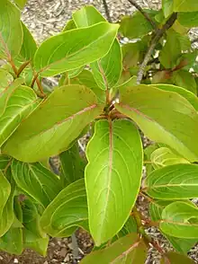 This tree reaches a height of 5–13 m (16–43 ft).[3] The trunk is coated in shredding gray-brown bark and the smaller twigs are reddish. The leaves are oppositely arranged and have pointed oval blades. The yellow-green flowers occur in clusters of 10 to 12. The fruit is a rounded capsule which is explosively dehiscent.[4]