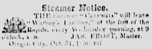 Columbia began its first trip up the Columbia on the morning of July 3, 1850, with James Frost acting as captain.[3] No one on board knew where the channel was, and the steamer's progress was slow. To act as pilots, Frost hired two young people of the Coast Salish who had been fishing on the river. By the end of the first day, they had travelled fifty miles, and Frost, not wanting to risk the vessel in the dark, tied up to the riverbank.[3] The next morning, July 4, 1850, the steamer cast off again and proceeded upstream, arriving at Portland, Oregon (then only a small settlement) at 3:00 p.m.[4] After staying at Portland for abouttwo hours, Columbia then proceeded on to Oregon City, arriving there at 8:00 p.m., where there was a celebration of the vessel's arrival.[2][4] It had taken 26 hours to make the trip.[7]