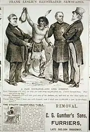 With Red Cloud's refusal, Delano reluctantly let the Indians take the unsigned agreement back to their tribal agencies for further discussion among the members of the tribe, with final terms and signatures to be negotiated later by an appointed commission.[76] The failure of the Washington, D.C. negotiations to produce an agreement was lampooned in the June 19 edition of Frank Leslie's Illustrated Newspaper. Upon their return to Sioux country, Red Cloud and other Lakota leaders finally signed away their hunting rights to the Black Hills under Article 11 of the Treaty of Fort Laramie in exchange for the original $25,000 Congressional appropriation. Another group of Sioux chiefs, including Sitting Bull and Crazy Horse, challenged Red Cloud's authority and started the armed resistance about which Delano had warned Grant.[77] This challenge to Red Cloud's authority combined with Lakota unhappiness over white encroachment into the Black Hills resulted in the Great Sioux War, which started in February 1876.[77]