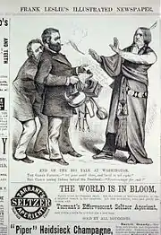 Delano remained active in politics and supported Grant for president in 1868. When Grant became president in March 1869, he appointed Delano Commissioner of Internal Revenue; Delano served from March 11, 1869, to October 31, 1870.[15] As commissioner, Delano tried with mixed success to collect federal revenue on alcohol and tobacco products manufactured in Indian Territory; these items could be produced for sale tax-free within the territory, but manufacturers routinely sold them in adjacent states without paying the taxes.[27] He also proved unwilling or unable to cope with the frauds of the Whiskey Ring; despite having received warnings of corruption including bribery of federal officials and failure to pay taxes, Delano took little or no action.[27][28] The department did attempt to prevent the illegal manufacture and sale of whiskey in other areas; on January 31, 1870, an Internal Revenue raid in Georgia captured 18 illicit whiskey stills and their operators.[29] The Whiskey Ring was finally stopped in 1875 during Grant's second term by Secretary of the Treasury Benjamin Bristow.[30] The ring leader, John McDonald was an acquaintance of President Grant and had requested from him a political appointment as superintending inspector of internal revenue in St. Louis. Grant then directed Delano to make the appointment. McDonald was convicted of fraud and theft and served 17 months in prison. In all, the investigation of the Whiskey Ring resulted in 110 convictions. Grant's private secretary, Orville E. Babcock was implicated, but acquitted at trial after Grant provided written testimony on his behalf. Additionally, Delano was cleared of involvement in another scandal in which Babcock was implicated, the Gold Ring, which was triggered when two New York financiers attempted to corner the gold market on September 24, 1869. Daniel Butterfield, the Assistant Treasurer of the United States, and Grant's brother in law Abel Corbin were also implicated; Butterfield was forced to resign in October. Delano's reputation for personal honesty was not in question, which was an asset when Grant needed to nominate a new Secretary of the Interior in 1870.[21]