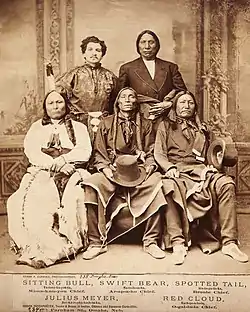 In mid-May 1875, Red Cloud, Chief of the Oglala Lakota (Sioux), and other Indian tribal leaders were brought to Washington D.C. to negotiate the sale of the Black Hills.[71] The Sioux believed the amount offered by Congress was too low;[72] recognizing that they would eventually lose the Black Hills, Red Cloud decided to negotiate and told Delano they would sign away the Black Hills if $25,000 in cash was first drawn from the Treasury Department, to ensure that the Sioux would be paid.[73] Delano had no intention of giving Red Cloud cash, but rather a receipt for $25,000 from the Treasury and additional presents purchased at a later date and distributed to members of the tribe.[73] Red Cloud insisted that he wanted the $25,000 in cash at the signing, which would be taken home and divided among the members of the tribe.[73]
