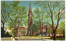 Postcard showing Columbus Hall (St. John's School) and the parish church. ca 1935.