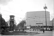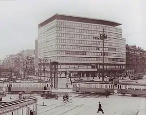 "Dedicated to an idealist version of America", it was intentionally revolutionary,[9] its height and modernity in sharp contrast to the other buildings in the square, which were predominantly classical in detailing and many of which dated to the Gründerzeit of the last quarter of the 19th century. It was to have been part of a reconfiguration of Potsdamer Platz and the adjacent Leipziger Platz as modern spaces which was planned by Stadtbaurat Martin Wagner; as a result of the Depression, the Columbushaus was the only part of the project built.[7][10] Mendelsohn planned the Columbushaus as part of a wall of skyscrapers around the reformed square; first, in 1928, proposing to combine both squares and in a second conceptual sketch, in 1931, making an octagonal plaza separated from Potsdamer Platz proper.[11][12] Although no other buildings were built to place it in the intended context, the "last masterpiece of Mendelsohn's German period"[13] was highly influential.[14]