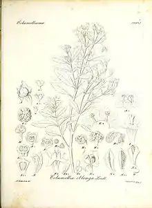 3. Ruiz López, Hipólito & Pavón, José Antonio. 1794. Florae Peruvianae, et Chilensis Prodromus 3, plate 8, figure a. line drawing of Columellia oblonga at upper left of page