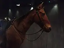 Comanche died of colic on November 7, 1891, believed to be 29 years old at the time.[3] He is one of only four horses in United States history to be given a military funeral with full military honors, the others were Black Jack, Sergeant Reckless and Chief.[4][5][6] His remains were not buried but instead were sent to the University of Kansas and preserved, where the taxidermy mount can still be seen today in the university's Natural History Museum.[7] Comanche was restored by museum conservator Terry Brown in 2005.[8]