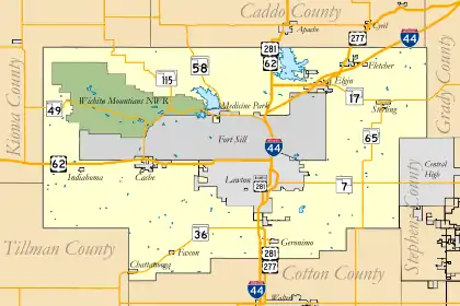 There are three cities in Comanche County. The largest, Lawton is located in the center of the county and is the county seat.[17] According to the US census, the population of Lawton was 96,867 in 2010, which is 78 percent of the county's population. Cache is located to the west of Lawton on US Highway 62 and has a population of 2,796. In the northeast, Elgin is located along Interstate 44 and has a population of 2,156. Several towns dot the county including: Fletcher, Sterling in the northeast, Medicine Park in the north central region, Indiahoma in the west, Geronimo in the southeast, and Chattanooga and Faxon in the southern regions of the county.[18] Also located in Comanche County is Fort Sill. The 90,000 acre installation is home to the US Army Field Artillery Training Center and the Air Defense Artillery.[19]