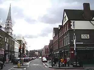 Spitalfields was historically one of the poorest, most overcrowded and most crime-ridden districts in London: a parliamentary report of 1838 described this area as harbouring "an extremely immoral population; women of the lowest character, receivers of stolen goods, thieves and the most atrocious offenders".[1] The southern section of Commercial Street was created in 1843–5 as part of a slum clearance programme, and to connect the Whitechapel thoroughfare with Spitalfields Market.[2] It was laid out by the architect and planner Sir James Pennethorne along the approximate line of former Essex Street, Rose Lane and Red Lion Street, and entailed the demolition of some 250 sub-standard properties in Whitechapel and Spitalfields. The extension north from the market, to the Eastern Counties Railway's Bishopsgate terminus and to Shoreditch High Street, was made between 1849 and 1857 and opened in 1858.[3][4] In both phases of development there was some initial difficulty in finding tenants for the building plots, and much of the street was not built up until the 1860s and 1870s. Only once Great Eastern Street had been laid out further north between 1872 and 1876, creating a continuation of the route towards Old Street and the City Road, did Commercial Street really begin to succeed as what had always been Pennethorne's aim, an artery allowing traffic to bypass the City of London. With the implementation of the London Congestion Zone in the 2000s, the road has once again seen continued activity from private and commercial vehicles seeking to avoid the 7am–6pm charge, and is a typical arterial route for emergency vehicles.