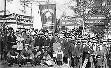 The first congress of SKNL was held in Stockholm, Sweden, August 10-August 15, 1929. The delegates from Finland travelled by boat from Helsinki or, clandestinely, by motorboat from Jakobstad. The delegates residing in the Soviet Union travelled via Germany. In total there were 22 delegates at the congress. Initially the Stockholm City Library had been selected as the congress venue, but in order to avoid police infiltration the venue was shifted to a private residence. Whilst the congress reaffirmed its commitment to the legacy of the Communist Youth International, it did also criticize the International for not paying enough attention to the sections working in illegal conditions.[12] The congress elected a Central Committee of the SKNL. The new leadership got into trouble as soon as they returned Finland. The police was able to identify several congress participants. In late 1929 the leadership of SKNL included Heikki Ilvesviita, Toivo Karvonen, Tatu Väätäinen, Paavo Kivikoski, Aatto Sallinen, Aili Mäkinen, Airi Virtanen and Reino Tynkkynen.[13]