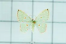 The wingspan is about 20 mm. Adults are green with several red dots on each wing.