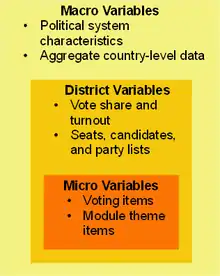 The Comparative Study of Electoral Systems (CSES)[1] is a collaborative research project among national election studies around the world. Participating countries and polities include a common module of survey questions in their national post-election studies. The resulting data are collated together along with voting, demographic, district and macro variables into one dataset allowing comparative analysis of voting behavior from a multilevel perspective.