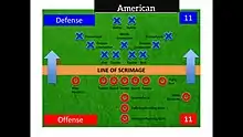 American teams use 11 players, while Canadian teams have 12 players on the field per side. Both games have the same number of offensive players required at the line of scrimmage, so the 12th player in the Canadian game plays a backfield position on offence, whereas this is usually a defensive back on defence.[8]