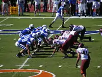 The ball is put into play by a snap. All players line up facing each other at or behind the line of scrimmage. One offensive player, the center, then passes (or "snaps") the ball between his legs to a teammate, usually the quarterback.