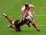 A rugby union match from the 2011 World Cup showing the sport's distinguishing feature: the ball carrier leads his team up-field, passing backwards in the event of a tackle