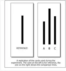 In Solomon Asch's experiment, 50 participants were placed in separate ambiguous situations to determine the extent to which they would conform. Aside from a single participant, the 7 other experiment members were confederates—individuals who understood the aim of the study and had been instructed to produce pre-selected responses. In the designated room, a picture of three lines of differing lengths was displayed. Each confederate was asked questions (e.g., which line is the longest, which line matches the reference line). In response, confederates gave largely incorrect answers.[18]