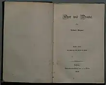 Parallel to these renewed efforts on The Ring was Wagner's work on a lengthy essay entitled Oper und Drama ("Opera and Drama"), which musicologist Deryck Cooke (1979) has described as, "essentially a blueprint [for the Ring]". Wagner's principal theoretical work, Oper und Drama grew out of a draft of an essay on Das Wesen der Oper ("The Essence of Opera"), which, preparatory to the composition of Siegfried's Tod, he wrote in an attempt "to tidy up a whole life that now lay behind me, to articulate each half-formed intuition on a conscious level....".[22] First mentioned in a letter to Theodor Uhlig on 20 September 1850, the work was begun by 9 October. Wagner, it seems, anticipated that it would be no longer than the other essays he had recently completed; but over the winter of 1850–1851, it grew into a book of some considerable size. Completed by 20 January 1851, just four months after Wagner conceived it, it was first published in 1852 by J. J. Weber of Leipzig. It was in the pages of Opera and Drama that Wagner's nebulous or half-conscious ideas on artistic method and the relationship between music and drama were first given concrete expression.[23]
