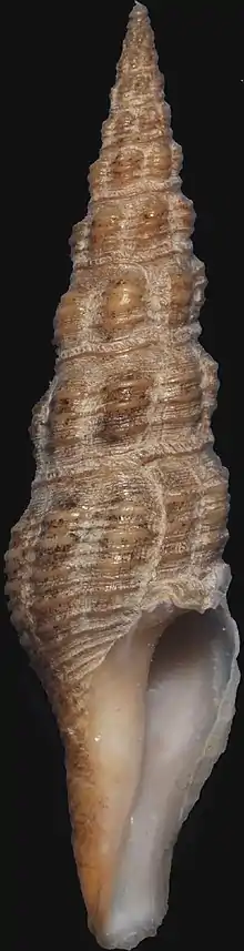 The original description is as follows: "The solid, slender shell is pale brown or whitish. It contains ten whorls (the nepionic whorls lost) strongly appressed at the suture; anal fascicle close to the suture,. The whorls are smooth or faintly spirally striated, rather wide and excavated. The notch is wide, not very deep. The sculpture consists of about six strong, short, turgid ribs obsolete in front of the periphery and on the last half of the body whorl. These are crossed by from two to five spiral threads stronger on the summits of the ribs, especially the pair which first appear, and faint, finer, spiral striations between the ribs. The lines of growth are well marked. The aperture is elongate. The outer lip is moderately thickened. The inner lip and aperture are white. The siphonal canal is rather wide."[2]