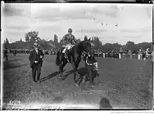 Owned by the Evremond de Saint-Alary whose stable raced in England and France, Comrade was purchased for only 26 guineas.[1] Trained by the renowned British horse trainer Peter Gilpin, Comrade won all three of his races as a two-year-old in 1919. In July 1920 the three-year-old Comrade won the most important race in France at the time, the Grand Prix de Paris. He returned to France in October and was ridden to victory by jockey Frank Bullock in the inaugural running of what is now France's most prestigious race, the Prix de l'Arc de Triomphe, beating the six-year-old King's Cross by a length.