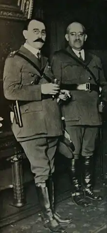 A coup d'état deposed the aging President Hipólito Yrigoyen on September 6, 1930. His country's first leader elected via secret male universal suffrage, Yrigoyen had strained alliances within his own centrist Radical Civic Union (UCR) through frequent interventions against unwillful governors and had set business powerhouses such as Standard Oil against him through his support of YPF, the state-owned oil concern founded in 1922.[3] Staging its first coup since 1861, the Argentine military, then dominated by conservative, rural interests, called on José Félix Uriburu, a retired general and member of the Supreme War Council, to assume the role of Provisional President. The ailing Uriburu called general elections for November 1931.[4]