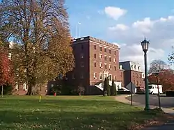 Woodward Hall, erected around 1886, is in the Queen Anne style.[2] It has an irregular profile that is accentuated by many ells. The structure exhibits multiple roofs capped by numerous chimneys, wide turrets, and large, gabled dormers. The interior has been recently remodeled. The Queen Anne style section of Woodward Hall was torn down in 2007, and there are tentative plans to develop a garden where it once stood. The "newer" section of Woodward Hall (built in the early 20th century at the same time Weeks Hall was built) still stands and houses the geriatric wards.