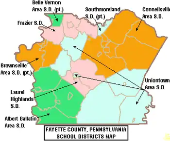 The Connellsville Area School District is a large rural, public school district which covers the City of Connellsville, the Boroughs of Dawson, Dunbar, Seven Springs, South Connellsville and Vanderbilt and Bullskin Township, Connellsville Township, Dunbar Township, Saltlick Township, Springfield Township and Stewart Township in Fayette County, Pennsylvania. The district encompasses approximately 216 square miles (560 km2). According to 2000 federal census data, Connellsville Area School District serves a resident population of 38,303. By 2010, the district's population declined to 34,453 people.[1] The educational attainment levels for the Connellsville Area School District population (25 years old and over) were 85.2% high school graduates and 11.6% college graduates.[2] The district is one of the 500 public school districts of Pennsylvania. Connellsville Area School District was established in 1966. It is considered a Second Class public school district due to its resident population exceeding 30,000, but being less than two hundred fifty thousand (250,000) people.
