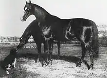 Conquérant came from crosses between two breeds of horse, the Norfolk Trotter and the Thoroughbred.[25][26][27] The Norfolk Trotter can be traced back to both paternal and maternal origins.[28] His sire, Kapirat, and his dam, Elisa, both came from crosses between Norfolk Trotters and Thoroughbreds.[25] This type of crossing, which resulted from the introduction of the Trotter Norfolk in France,[29] was common in the 19th century to produce the best speed trotters.[30]