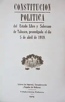 The Constitution of the State of Tabasco (Spanish: Constitución Política del Estado de Tabasco) is the document that describes the structure and function of the government of the State of Tabasco. The 1919 constitution, which took effect on 5 April 1919, is the current constitution of Tabasco.