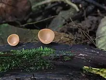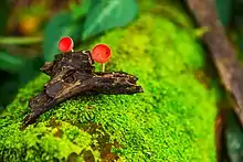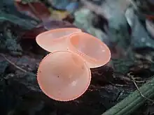 Cookeina is a genus of cup fungi in the family Sarcoscyphaceae, members of which may be found in tropical and subtropical regions of the world. Species may be found on fallen branches of angiosperms, trunks, and sometimes on fruits.[2] The Temuans of Peninsular Malaysia are reported to use certain species from this genus as food, and also as a bait for fishing, where it is rubbed against the hook.[3]