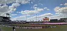 Sarasota-based Tandem Construction and Southfield, MI based Barton Malow was in charge of project.[5][27] The construction schedule was to complete the stadium in time for when pitchers and catchers report to camp in February 2019.[5] However, on January 31, 2018, the Braves announced they would extend their lease with Disney's ESPN Wide World of Sports through April 2019 "to ensure there is enough time to complete” the new facility.[11] The team held their 2019 spring training at Disney and played their final spring training home game at the new facility.[11]