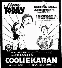 Cooliekkaran (transl. Male coolie) is a 1987 Indian Tamil-language action thriller film directed by Rajasekhar and produced by S. Thanu. The film stars Vijayakanth and Rupini, in her Tamil cinema debut.[1] It is a remake of the Hindi film Kaalia (1981).[2] The film was released on 4 June 1987.[3] Through this film Vijayakanth got the title "Puratchi Kalaignar" (transl. Revolutionary Artist), bestowed upon him by Thanu.[4]