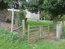 The churchyard is one of very few to have a tapsel gate — a centrally pivoted gate unique to Sussex.[4][8][9] An ancient crucifix was found in the churchyard in 1877, when it was moved into the church.[2] The age of the brick and stone font is not known. It may be 19th century[2] but other sources propose more ancient origins.[4]