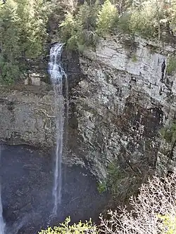 Coon Creek Falls, is a 250 feet (76 m) plunge waterfall which shares a plungepool with Fall Creek Falls. The falls are not always present, depending on the amount of precipitation in the area. The falls are located near Spencer, Tennessee in Fall Creek Falls State Park.[1]