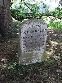 Copenhagen (1808 – 12 February 1836) was the Duke of Wellington's war horse, which he most famously rode at the Battle of Waterloo. Copenhagen was of mixed Thoroughbred and Arabian parentage, with his dam being sired by the Derby winner John Bull and his sire Meteor having finished second in the Derby. Copenhagen was foaled in 1808 and was named in honour of the British victory at the Second Battle of Copenhagen. Copenhagen did race in England for a short period, winning two races and finishing at least third in nine races out of his 12 career starts. Copenhagen was sent to Spain with Sir Charles Vane in 1813 and was then sold to the Duke of Wellington. Becoming his favourite, Copenhagen was the Duke's mount in the Battle of Waterloo. The horse was retired to the Duke's Stratfield Saye estate and lived there for the remainder of his life, dying on 12 February 1836 at the age of 28 years. His grave site is marked with a marble headstone that stands under a Turkey Oak planted in 1843.