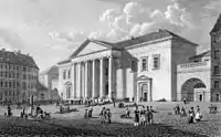 After the fire, it was decided to build a combined city hall and courthouse at Nytorv, at a site previously occupied by the Royal Orphanage built in 1728.[4] The project also included a jailhouse.[5] Christian Frederik Hansen, the leading Danish architect of the time, was charged with the commission. Construction started in 1803 and was completed in 1816. The project was delayed by scarcity of building materials as well as the British bombardment of the city in 1807 in the Battle of Copenhagen. Materials from the demolition of Hirschholm Palace were used for the building.[6]