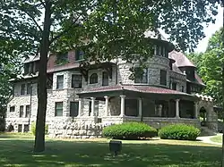 The house was designed by Lamb and Rich (1882-1903) of New York City. It is a Queen Anne style with substantial Romanesque features. The pergola and Italian sunken garden were designed by Alice E. Neale of New York City. The House is three floor with an attic. The basement and first two levels are Indiana fieldstone granite, culled from the countryside of St. Joseph County. The porch pillars are Vermont stone. The third floor and the attic are sheathed in tile. The roof is a simple ridge with gable ends and a tower on the northeast corner. On the back is a projecting gable with dormer windows The music room and den are separate one story projections.[3]