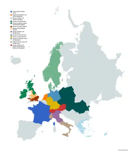 The Coptic Orthodox Church has many churches and congregations in Europe and on 2 June 1974 Pope Shenouda III received into the Coptic Orthodox Patriarchate of Alexandria a native Orthodox Church in France known as the French Orthodox Eparchy, along with their Primate, who in turn was accepted after consecration into the Episcopate, in the Holy Synod of the Church of Alexandria and hence was appointed their Primate Marcos (Mark), as the first Bishop and Athanasius as Chorbishop of The French Orthodox Eparchy.[1] There are 15 Coptic Bishops serving in Europe.[2]