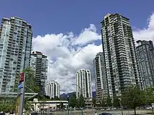 ![]() Skyscrapers in the Town Centre area of the city of Coquitlam, with the North Shore Mountains in the background. | |