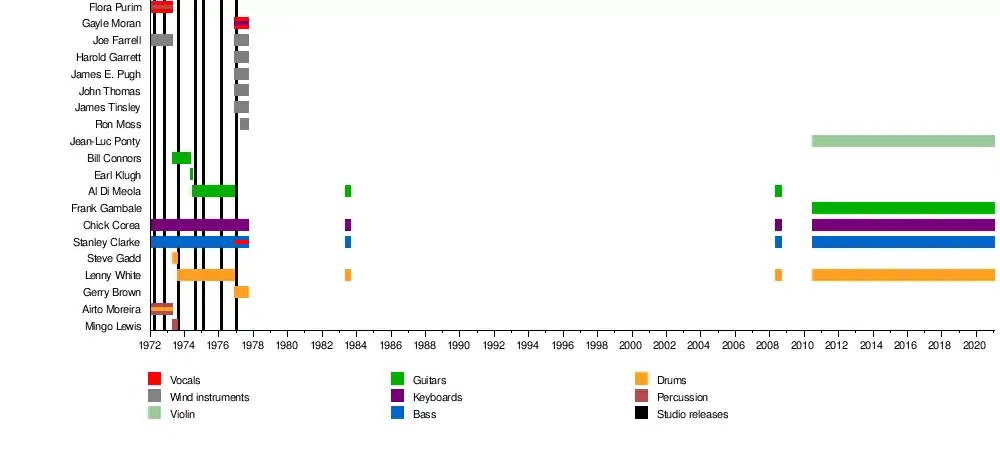 | Past members | Chick Corea Stanley Clarke Joe Farrell Airto Moreira Flora Purim Lenny White Bill Connors Steve Gadd Mingo Lewis Earl Klugh Al Di Meola Gerry Brown Harold Garrett Gayle Moran James E. Pugh John Thomas James Tinsley Ron Moss Frank Gambale Jean-Luc Ponty |
