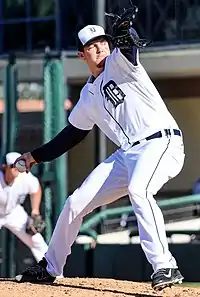 Knebel was drafted by the Detroit Tigers as the 39th pick in the 2013 Major League Baseball Draft. This supplemental pick was the first traded draft slot in Major League history.[6] The pick was included in a 2012 trade between the Tigers and the Miami Marlins, which included Aníbal Sánchez, Omar Infante, and Jacob Turner.[7] Knebel played for the Class-A West Michigan Whitecaps, the Double-A Erie SeaWolves and the Triple-A Toledo Mud Hens before being called up by the Tigers. He made his major league debut on May 24, 2014, against the Texas Rangers.[8]