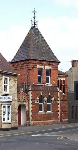 The building was designed by Charles Bell in the Italianate style, built by Robert Young of Lincoln in red brick with stone dressings at a cost of £2,000 and was officially opened on 13 October 1870.[2][3] The design involved an asymmetrical main frontage of four bays facing onto Abbey Road. The central section of two bays featured a two-stage tower with round headed windows, flanked by short Corinthian order pilasters supporting voussoirs, in the first stage, and square headed windows in the second stage: it was surmounted by a steep pyramid-shaped roof with brattishing and a weather vane. The left-hand bay, which was single storey, was formed by a porch with an gable containing a stone shield inscribed with the words "Public Hall", while the right-hand bay was fenestrated on the first floor by three lancet windows of differing sizes. Internally, the principal rooms were the hall keeper's accommodation, which was in the tower at the front, and the main hall behind, which was 75 feet (23 m) long and 35 feet (11 m) wide.[4]