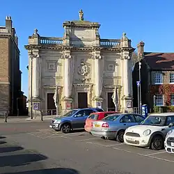 The current building was designed by Frederick Haydon Cruso and Alfred William Maberley in the Baroque style, built in ashlar stone and was completed in 1854.[5] The design involved a symmetrical main frontage of three bays facing onto Tuesday Market Place. The central bay featured a doorway with an architrave, a frieze and a cornice supported by brackets on the ground floor, and a panel containing a carved borough coat of arms on the first floor. The outer bays contained similar doorways on the ground floor and panels containing carved sheafs of corn on the first floor. The bays were flanked by full-height Ionic order columns supporting a modillioned cornice and a balustraded parapet. At roof level, there was a central panel carved with the words "Corn Exchange Erected 1854" and surmounted by a statue of the goddess, Ceres.[1] The architectural historian, Nikolaus Pevsner, described the design as "jolly and vulgar".[6]
