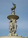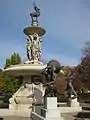 The fountain features four bronze Saukiog braves around the lower basin, a center pedestal surrounded by four bronze Oneida maidens, and an upper basin topped by a bronze hart. The Saukiog braves are: (west side) holding a spear; (south side) wearing a feathered headdress and scanning the horizon; (east side) raising a tomahawk; (north side) holding a peacepipe and lifting his hand in a gesture of peace. Below the upper basin are four animal heads as water spouts (a catamount, a bear, a fox, and a beaver). As viewed Sept. 15, 2017 these have been removed. Below the lower basin are four lion heads, which are also water spouts. Water flows over the edges of each tier and into a large concrete basin at the base of the fountain.