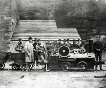 The mine was connected by a 1 mile (1.6 km) long 1 ft 10 in (559 mm) gauge light railway to Whitfield Brow.[7] The mine's steam locomotive Samson was built by Stephen Lewin of Poole in Dorset in 1874 as an 0-4-0G steam locomotive.[8][9] It had power of 2½ or 3 nhp and a loaded weight of 2.6 t.[10][11] Its footplate provided just enough space for the engineer, who could sit on the rear buffer beam, as known from its even smaller sister locomotives 'Ant' and 'Bee' of the Great Laxey Mine.[12] The locomotive was probably scrapped around 1904.[7]