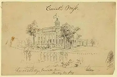 Its main building was commandeered by the Union Army for use as a hospital during the nearby battle of Shiloh in 1862, as was the nearby Tishomingo Hotel.[5] The Union Army evacuated the area in 1864, burning the college's building. Corona Female College never reopened.[1]